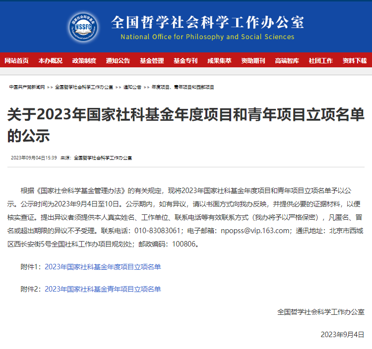 9月4日,全国哲学社会科学工作办公室公示了2023年国家社科基金年度项目和青年项目立项名单,我校共48项项目获立项公示,其中重点项目5项、一般项目31项、青年项目12项。哲学系有5位教师获得拟立项: