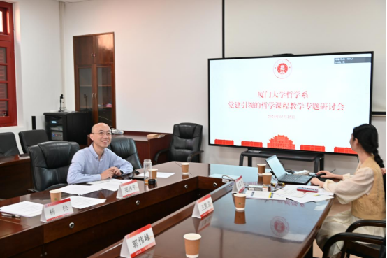 随后,哲学系举办了党建引领的哲学课程建设专题研讨会。肖覃文老师和郑伟平老师报告了在一流课程、教学比赛、教改项目、教材出版、成果评奖等方面哲学系的基本情况。朱菁主任强调教学是一项以学生为本的事业,哲学系将继续全力支持哲学课程建设与哲学学科人才培养工作。