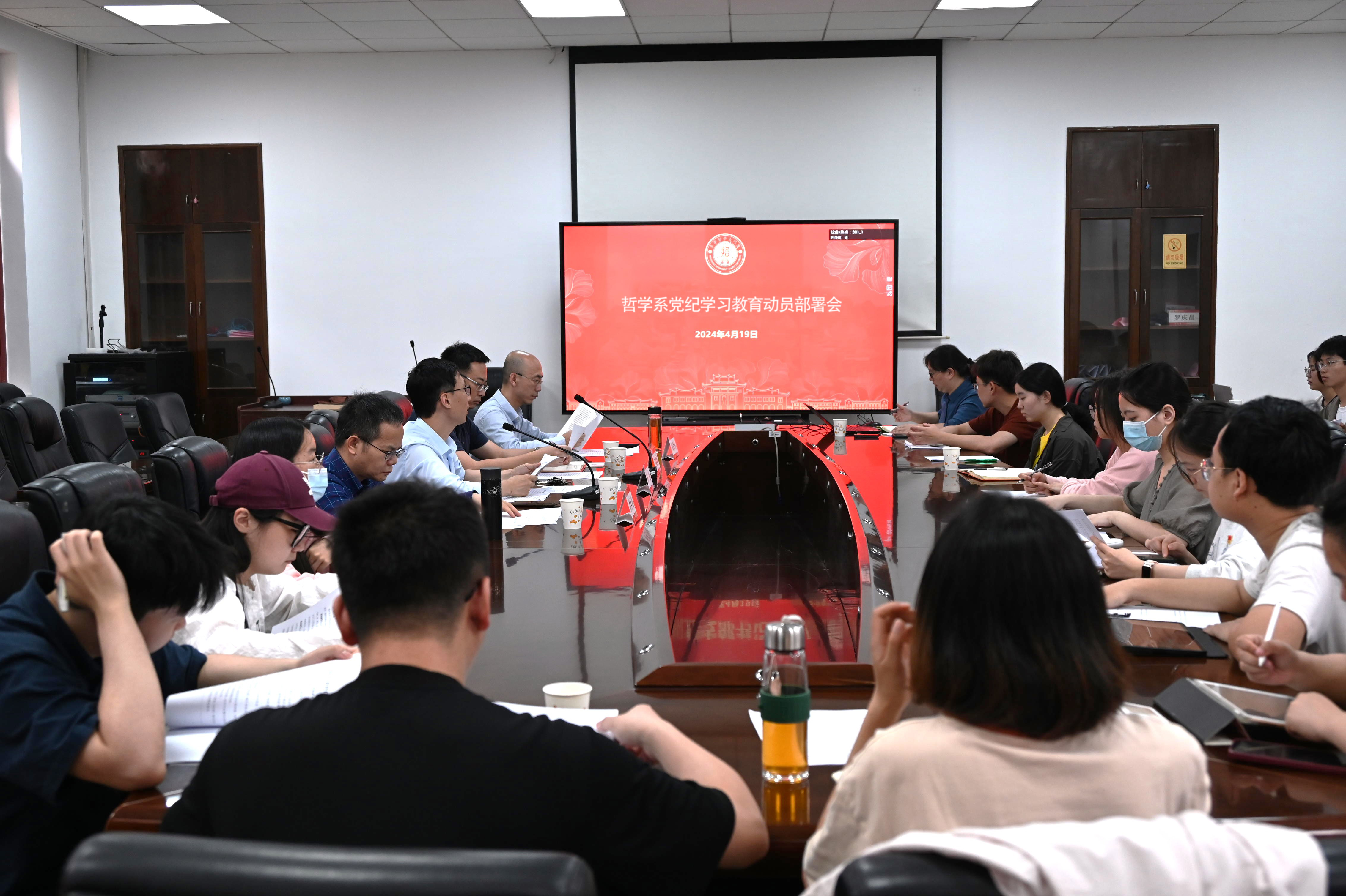 为深入贯彻落实习近平总书记关于党纪学习教育的重要讲话和重要指示精神,推动哲学系党纪学习教育走深走实,4月19日下午,哲学系在南光一320室召开党纪学习教育动员部署会,会议由哲学系党委书记杨松主持,系党委副书记王晓萌,系副主任林育川、郑伟平,师生党支部书记、支委和部分党员代表参会。