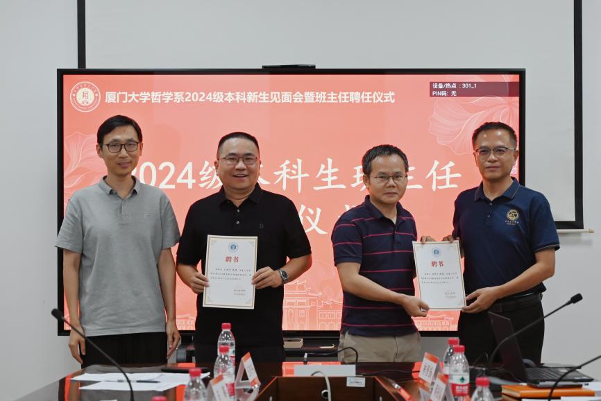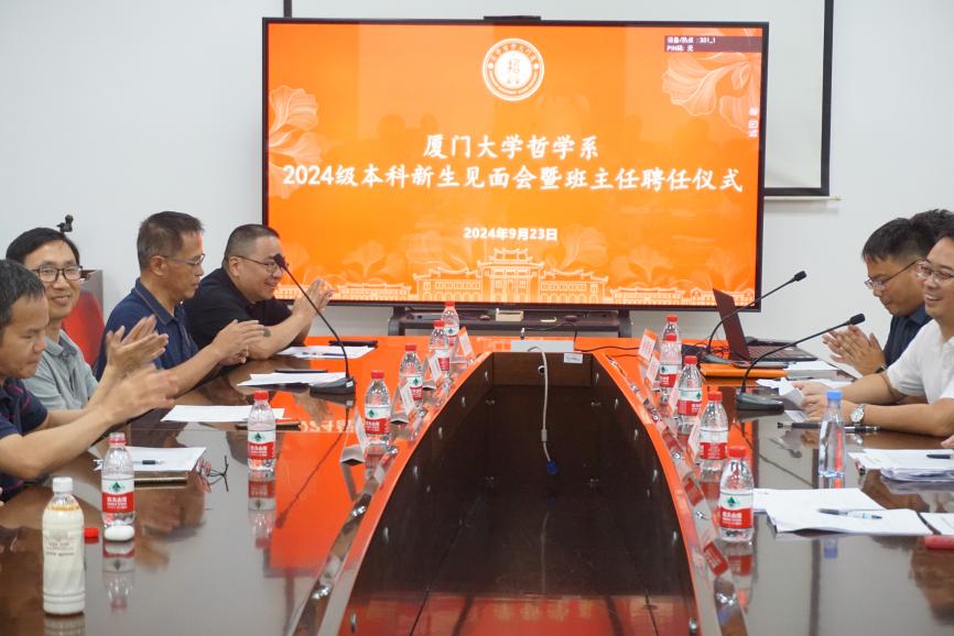 9月23日下午,厦门大学哲学系2024级本科新生见面会暨班主任聘任仪式在南光一320会议室举行。哲学系党委书记杨松,系主任朱菁,系党委副书记王晓萌,系副主任、2024级主修班班主任林育川,2024级强基班班主任王时中,系团委书记蔡振磊,本科生教学秘书肖覃文,研究生教学秘书蔡文倩,辅导员林晋扬及全体2024级本科新生出席见面会,会议由系党委副书记王晓萌主持。