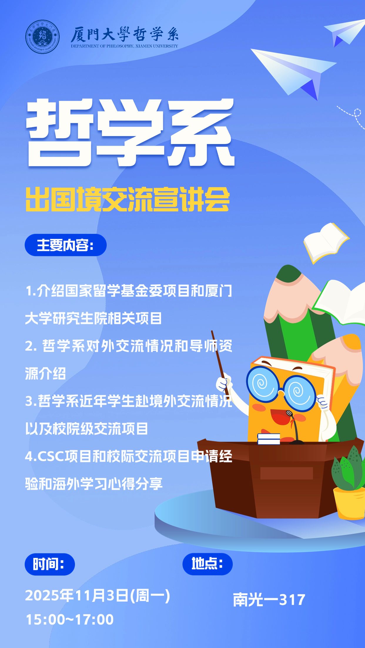为了鼓励学生积极参加出国境交流,开阔视野,提升学生学术交流能力和研究生培养质量,在朱菁系主任的大力倡导下,哲学系出国境交流宣讲会已连续举办4届。哲学系2025出国境交流宣讲会将于11月3日下午3:00~5:00在南光317会议室举办。除系领导、相关老师和有留学经验的学生参与介绍外,系里特别邀请研究生院负责研究生教育国际化工作的陈沁芳老师前来介绍国家公派出国留学项目,研究生国境外访学计划、国际学术会议资助项目的基本情况,以及各项目的申报流程、注意事项以及对学业、外语水平、先修课程以及经济条件要求等方面。每项宣讲内容结束后设有提问环节,欢迎本、硕、博同学踊跃参与。