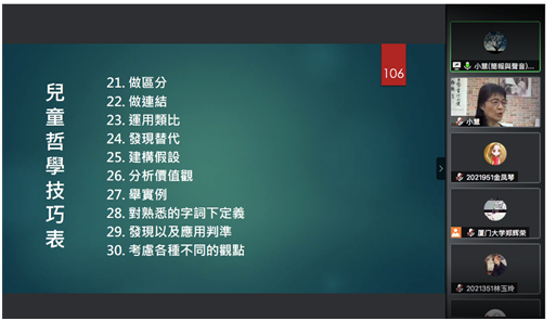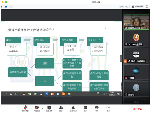 首先,郑敏希老师指出儿童哲学的对话活动以获得真理为目的。人们对于对话存在着许多惯常的理解,比如我们在对话之前就通常预设了一个固定的答案,这些理解阻碍了对话的开展与思维活动的生成。儿童哲学是关于真理的活动,不是真相的活动。真理是在儿童自主提问和不断的对话的过程中获得的答案;真相是客观的,先于问题和对话的。此外,郑老师还结合实用主义的真理观、现象学和存在主义等哲学理论说明了儿童哲学强调对话的理论依据。随后,郑老师指出儿童哲学对话使用的探究方式是理性的。通过分享“植物是否有欲望”的小故事,表明成人与儿童思维方式不同,但都是理性的。理性可以划分为“较强理性”和“较弱理性”,前者表现为成人式的有条理的、由前提推导出结论的逻辑理性;后者表现为合情合理的、能够持续地对话和探索的理性。儿童哲学所希望的理性在于儿童在团体探究中发现意义。最后,郑老师对对话的“本义”和“隐喻”进行了区分,展示了儿童隐喻的对话形式。针对儿童隐喻的对话特点,郑老师强调,儿童哲学教师要敢于做提供隐喻的人、重视儿童提出的隐喻。在讲座的问答环节,郑老师和同学们针对儿童哲学如何促进“融合教育”等问题展开了讨论。