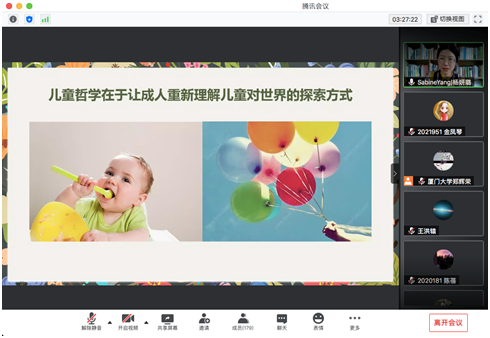 第一,童年情调表现为儿童总是充满疑问和好奇心。杨老师分享的很多小片段都表明儿童是自由的、充满疑问的“好奇宝宝”,他们有自己的儿童立场。教师或家长是缺乏儿童立场的,介入幼儿活动的教学只能是“估计”,不可能“精准”。杨老师认为:“幼儿教育是启蒙的,并且是适度启蒙的。”适度启蒙是与孩子有关系的、探索意义的,而不是一味地灌输科学知识。第二,童年追忆是成人的返乡之路。幼儿园教育的目标是自由、会思考和自我驱动。杨老师指出幼儿园是最像大学的地方。她分享了“哲学学生园区实践示范-哲学博士园区教研探讨-哲学教授园区智慧引领”的实践模式,重视幼儿的学习品质,如对周围事物的好奇心和兴趣等。杨老师强调幼儿园里的儿童哲学最好是情境里面诞生的东西,教师要通过对生活问题的抓取,进一步促进儿童理性思考与讨论,使儿童与世界产生联结。第三,童年哲学表现为作为教学的儿童哲学、作为师幼关系的儿童哲学和作为办园理念的儿童哲学。教师要具备一定的哲学知识,重新理解儿童对世界的探索方式,儿童哲学要求“克服自我”、克服成人的思维方式。在问答环节,杨老师和同学们针对幼儿园和小学的儿童哲学衔接问题和教师工作任务的分配等问题展开了讨论。