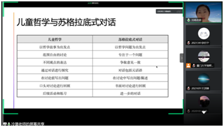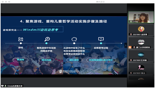首先,郑老师介绍了上海海富金太阳幼儿园探索儿童哲学课程的一些契机和发展历程。海富金太阳幼儿园致力于儿童哲学活动本土化的探究与实践,形成了独特且成体系的儿童哲学教学实践模式。第一,聚焦课程领导力、重构课堂体系。转变教学理念,设置“每周一次的儿童哲学活动日”。第二,聚焦创建智力情感安全基地、重构师幼、幼幼关系。注重幼儿的安全体验,建立开放自由的氛围,建构平等的对话。第三,聚焦各年龄段儿童哲学实施重难点、重构教师培训体系。划分小班、中班和大班活动的要点和内容,并配套有针对性的教师教学培训。第四,聚焦游戏、重构儿童哲学活动实施步骤及路径。采用游戏探究法,如windmill边玩边思考,形成了“刺激物—提出问题—团队探究—对自我或团队进行评价”的模式。第五,聚焦亲子对话、重构家校互动模式。鼓励幼儿提问、问到底,并进行深度探究。