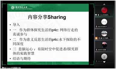 在第二部分中,古老师分别从群体探究特征、意义反思特征两个方面介绍p4c。一方面,p4c从诞生之初就是作为一种群体探究的生活课程进入教育,探究程序本身鼓励和包含着对现场不确定性的开放与包容,追求群体成员的参与性、平等性和真诚性。另一方面,p4c从目的上意在促进参与者对日常生活经验的意义反思,而参与者各自的生活经验、思考敏感维度与现有语言表达能力的不同,导致分享出来的思想在大哲学层面的确有深刻性和严谨性的差别。