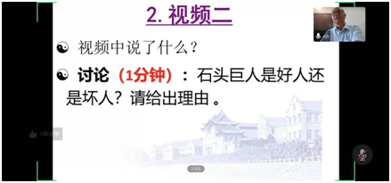 上午十一点,厦门大学哲学系曹剑波教授为学员带来一场主题为《好人还是坏人》的活动观摩课。本次课程邀请了几位2-4年级小学生进行课堂互动。整堂课主要围绕三个关于石头巨人的视频展开。每一段视频播放完毕之后,曹教授都会让学生探讨石头巨人是否为好人的问题,并请给出理由。