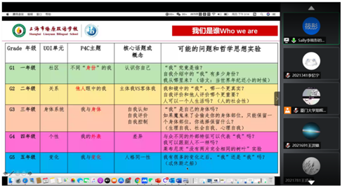 最后,李老师介绍了燎原双语学校融合IB小学项目和儿童哲学的情况。通过丰富的案例分享,李老师向大家展示了IB小学项目与儿童哲学融合之后的具体表现。IB小学项目主要讨论“我们是谁”等六大超学科主题。以“我们是谁”主题为例,燎原双语学校根据一年级到五年级儿童的特征,设计了相关的“子主题”,并且每一个“子主题”都有对应的哲学问题,具体而言,一年级到五年级讨论的主题分别为“身份”“关系”“身体”“外表”和“变化”,对应的哲学问题分别是“认识自己”“主体与客体”“自我评价”“差异”和“人格同一性”。李老师还分享了如何在数学课、语文写作课、整本书阅读课、以及校本课程中融合IB项目和儿童哲学。讲座结束后,学员们纷纷表示受益匪浅,李老师也十分感动的对同学们说“这些今天在场的所有学员,身上现在都带着儿童哲学的光,带着厦大哲学系的光。要珍惜这份幸运,用这份光去点亮启蒙很多的人。”