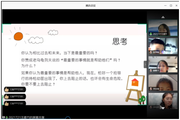 汪柔竹同学将关于托尔斯泰小说《三个问题》的儿童绘本的一段朗诵视频作为课堂引入,主要围绕故事中的小男孩尼古拉的两个问题进行讨论,即“什么时候是做事情的最佳时机?”以及“什么事是最应该做的事?”汪同学以一种循循善诱的方式引导同学们结合绘本故事内容和日常生活来思考“什么是时机”“时机与时间的区别”“什么是最重要的事”“如何判断一件事是否重要”等问题。在拓展部分,汪同学借助“电车难题”这一极具代表性的两难情景,引导学生进一步探讨在不同的情况下,对一件事情如何做出判断与选择。