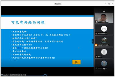 在点评环节中,曹剑波教授、陈玲教授和王奇琦老师都肯定了贾同学所选择的主题很好,也指出了其中的不足。曹老师指出由于贾同学的学生招募工作存在不足导致课堂效果大打折扣,提出了两点修改意见:一是修改教学内容的标题,以突出自己的教学主题;二是问题的设置需要符合教学的对象。陈老师指出课程的参与对象跨度过大,不利于课堂教学环节的设置和教学目的的实现。王老师建议在课程主题的设置上,选择教师本身能够驾驭的主题。