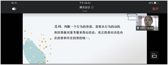 第二位汇报的学员是来自埃塞克斯大学的贾澄同学。他带来的是主题为《托尔斯泰与大学生的对话》的展示课。此次课堂的目标对象是初二至高二的学生,其教学目的是通过阅读“托尔斯泰与大学生之间的对话”,引导学生思考,学会不加评判地倾听异己观点。