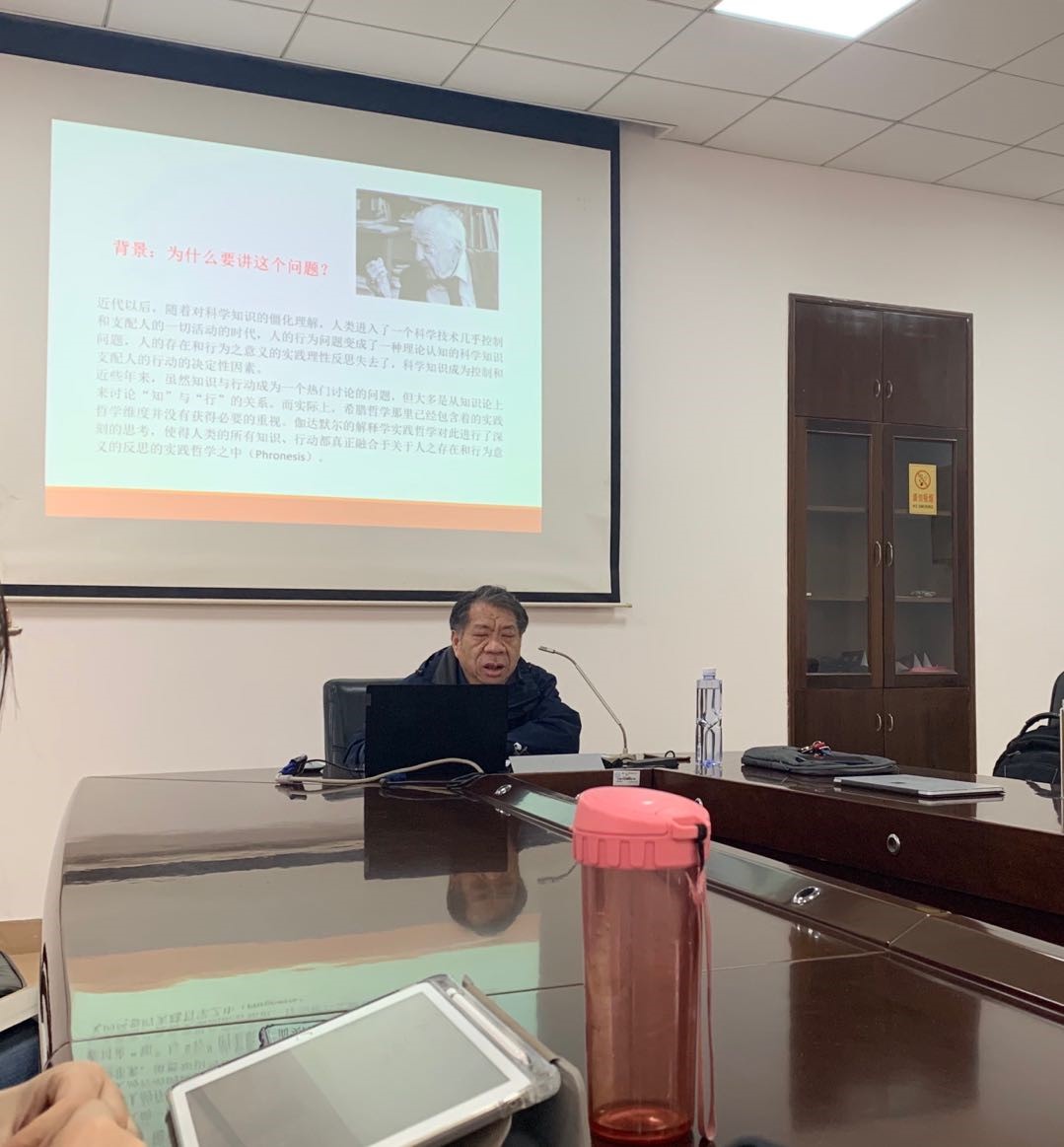 接着,张老师对“科学知识、行动何以是实践哲学的?”这一问题进行了论述。解释学所面对和试图去理解和解释的是我们所存在和生活于其中的经验的整体。因此,不仅精神科学、社会科学中存在着理解问题,包括自然科学在内的人类的一切知识和活动中都存在着解释学的理解和解释问题。而解释学的“理解与解释”是实践性的,它是将人的知识纳入到人的行动性的实践哲学思考中。可以说,知识问题本质上是内在于作为人的存在和行动的整体性共同性思考的实践哲学之中。相比于科学理论知识,实践知识或实践哲学是首要性和决定性的,也因此,一切知识、行动从根本上说都是实践哲学的。