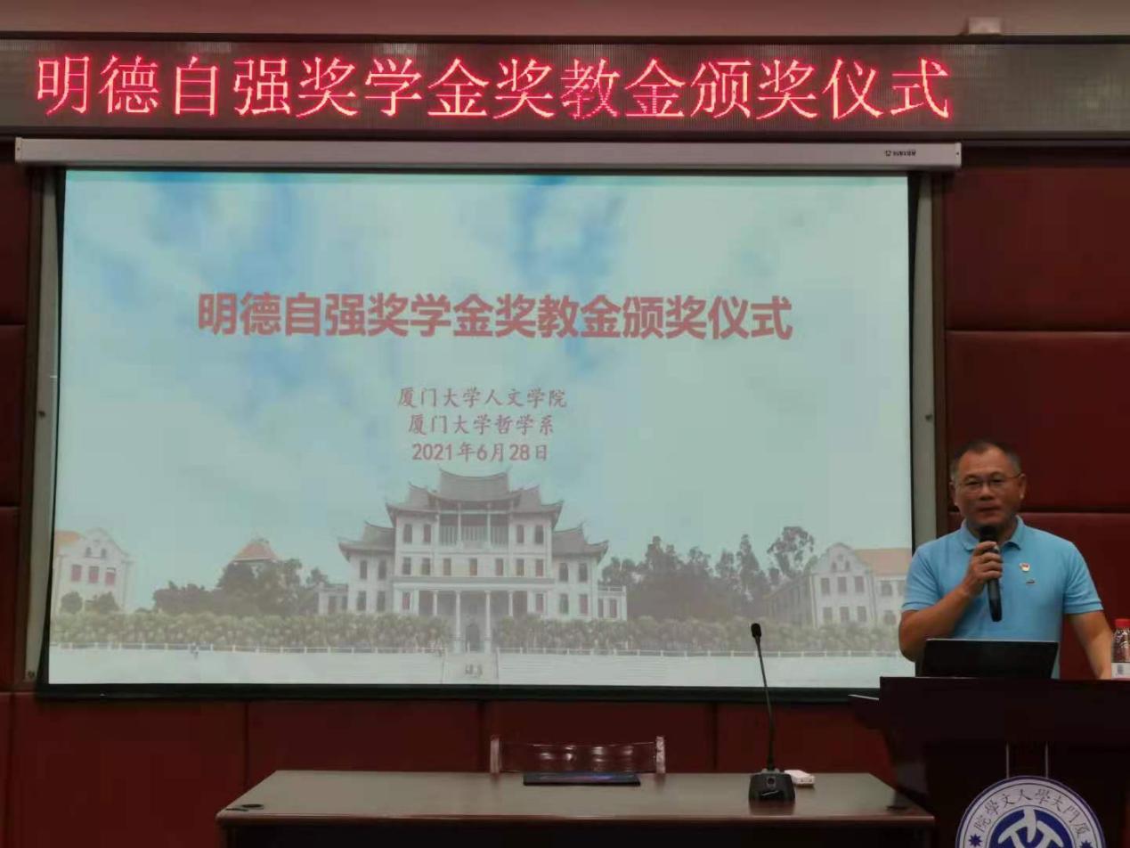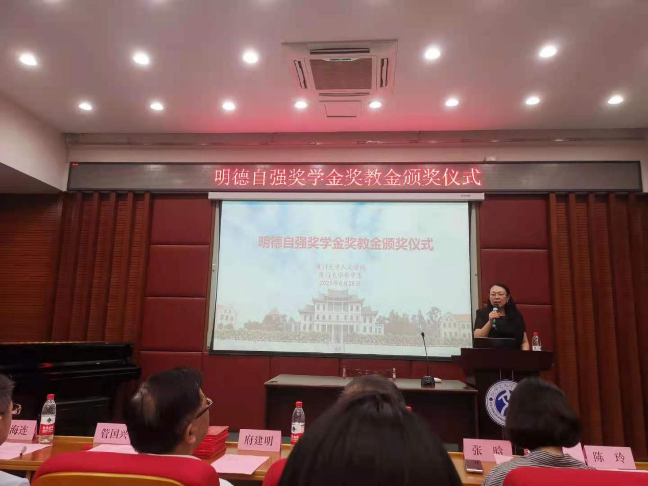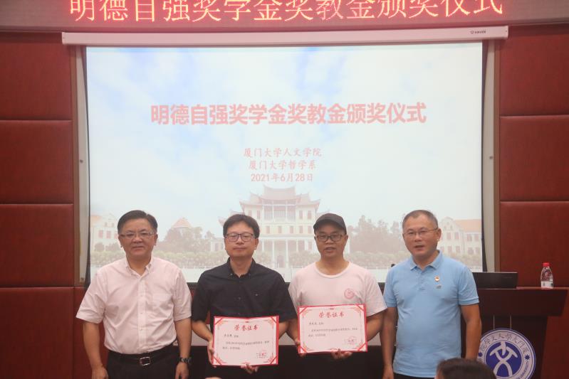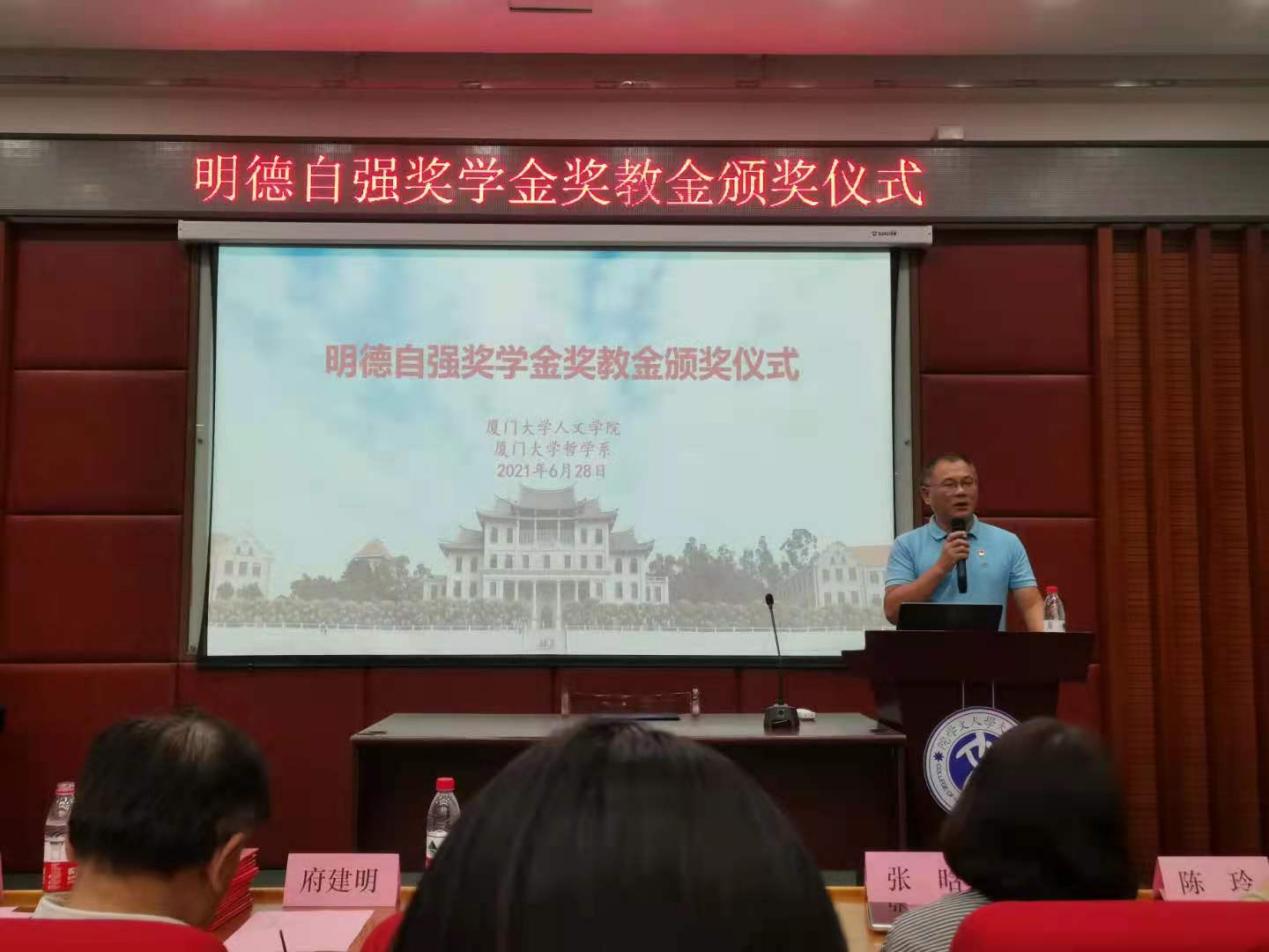随后,江苏宏德文化出版基金会理事长府建明和厦门大学人文学院党委书记高忠华颁发明德自强奖教金。