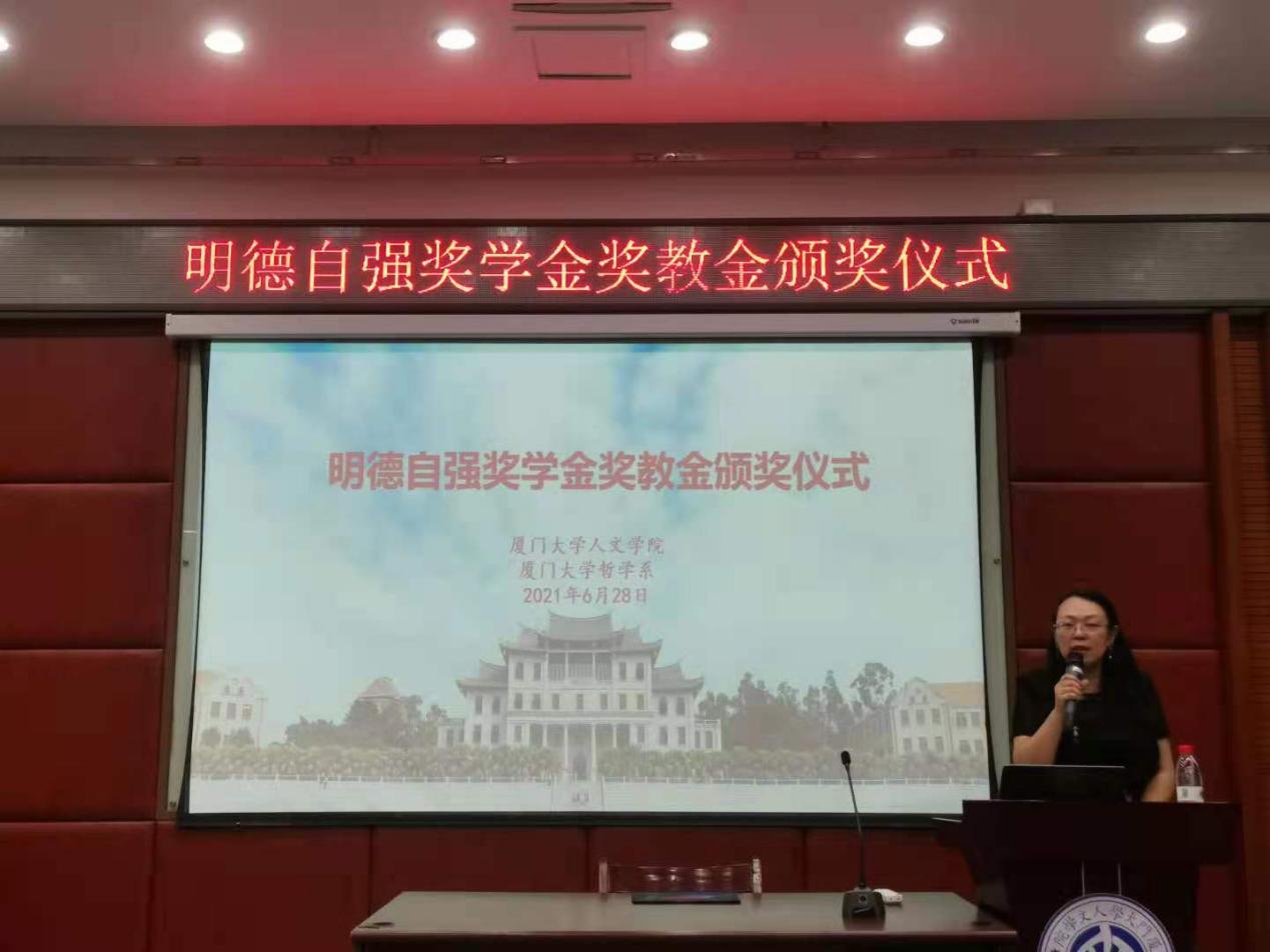 6月28日,厦门大学人文学院哲学系2021年度明德自强奖学金奖教金颁奖仪式在人文学院101报告厅举行。江苏宏德文化出版基金会理事长府建明、江苏宏德文化出版基金会副理事长兼秘书长管国兴、江苏宏德文化出版基金会副秘书长钟海连、人文学院党委书记高忠华、人文学院党委副书记张晗、哲学系主任曹剑波教授、哲学系党支部书记杨松教授及学院部分师生代表出席了颁奖仪式,颁奖仪式由厦门大学校友总会秘书处副秘书长、哲学系陈玲教授主持。