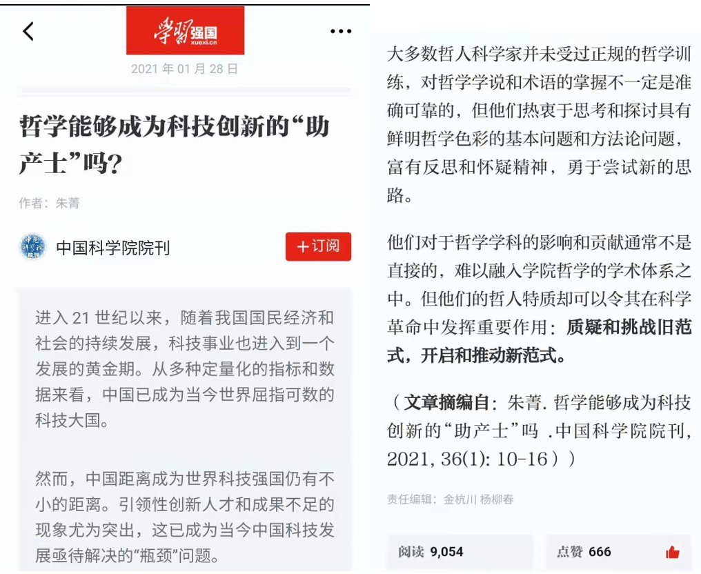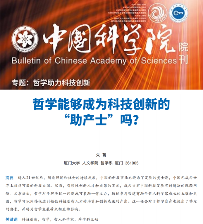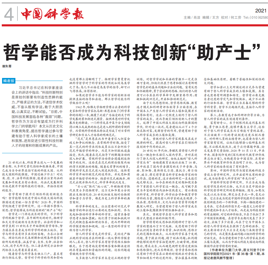 我系朱菁教授发表于《中国科学院院刊》2021年第1期的论文“哲学能够成为科技创新的‘助产士’吗?”,被《新华文摘》《中国科学报》等报刊以及学习强国、科学网、腾讯网和搜狐网等重要新媒体和门户网站纷纷转载和推送;此文还被遴选后翻译为英文,发表在Bulletin of Chinese Academy of Sciences(《中国科学院院刊》英文版)2021年第1期。此外,此文经摘编后,被用作江苏省苏北四市新高考适应性考试语文试卷的现代文阅读材料。