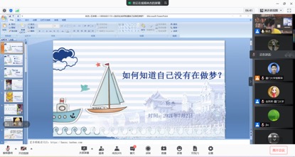 7月8日早上八点半,林杰同学为大家带来了第一堂儿童哲学展示课,其主题为《如何知道自己没有在做梦》。首先,林同学通过“唱反调”的互动小游戏调动孩子们的注意力和积极性,并且林同学以视频《梦境中的爱丽丝》为引入,让学生们从视频中的环境、人物、情节三个方面复述一遍视频中所讲的故事,并提问“你做过最真实的梦是怎么样的?”同学们纷纷分享出了自己做过的最真实的梦。接着,林同学给大家介绍了“庄周梦蝶”和“南柯一梦”的典故,并向学生们提问“故事中的主人公所经历的是梦境还是现实呢?”“主人公可以区分出自己是不是在做梦呢?理由是什么?”学生们从不同角度的对这些问题进行了回答,林同学总结了学生们的答案并进一步追问“我们是否具有区分梦境和现实的能力?”最后,林同学总结并肯定了学生们的回答,鼓励学生们多进行交流和思考,给学生们布置了相关的课外思考问题。