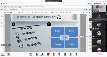 2021年7月4日上午八点半,华东师范大学教育学古秀蓉教授带来了《化教为交:儿童哲学的平民化身教与方法论价值》的讲座。古教授的讲座包含四个部分的内容:化“教”为“交”:p4c课程的改革;“平民化”身教:化理论为德行;哲学家教育法:化理论为方法;最后的总结。古教授在第一部分提出,传统的“教”,是将儿童置于被动的接受者地位;“交”意味着交流、交互等,在此之中,每一个人是平等的交流主体。古教授认为“化教为交”有着诸多好处,例如它可以融知与行,让儿童学会在群体中学会分享、发言和关爱他人等,有利于儿童在社会中生活、思考和创新。在实现形式上,“化教为交”可以大小相联,即大学生与儿童、大哲学与小哲学、优秀传统与个体经验等相互联系。在第二部分,古教授指出,“平民化”的教育理想一直存在,要化理论为德行,化理论为方法,知行一致。在第三部分,古教授阐释了“哲学家教育法”的六个原则,指出需要理论与实践并行,校内与校外连通,强调要体验优先、以学定教。最后,古教授指出,在教育关系中,要保持谦虚,不断在实践探索,注重师生、生生之间的心与心的在场连接。