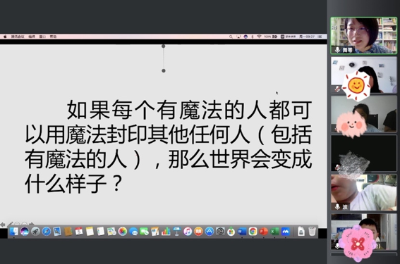 7月5日上午9点,贵州大学哲学学院张娅老师和10位四、五年级的小学生们为大家呈现了一堂精彩的儿童哲学观摩课——《魔法世界的秩序》。课程伊始,张老师通过“我被魔法封印了”的小情境引入话题。参与课程的小学生积极地参与到张老师的情景中。随后,张老师围绕三个核心问题,引导小朋友们展开对于魔法、秩序、幸福的思考与讨论。在回答张老师提出“如果大家都有可以封印其他人的魔法,那么世界会变成什么样子?”的问题时,小朋友们围绕穿越时空的魔法展开想象。有的小朋友认为“如果我们拥有穿越时空的魔法,那么将会分不清诗人是什么朝代的”;有的小朋友则会担心不能回到现在的生活世界。“魔法世界如何正常运行?是魔法能力还是其他?”是张老师提出的第二个核心问题。在对于该问题的回答中,有的小学生认为魔法世界的运行还需要依赖人的品格,如善良、诚信。在此基础上,张老师引导大家思考第三个问题,即“如何维护魔法世界的秩序?”。小朋友从消除世界的不平等、建立奖惩制度、团结他人等方面进行了回答。