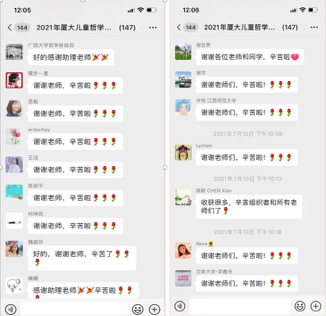 最后,郑博士宣布,“全球汉语儿童哲学理论与实践(第三期)云端暑期学校正式落幕,明年再会!”闭幕式结束后,学员们纷纷在腾讯会议聊天框、微信群和微信朋友圈表示感谢厦门大学、感谢厦门大学哲学系举办此次活动,大多数学员表示他们经过一周的学习对儿童哲学有了更加深入的理解、收获良多,并愿意继续实践儿童哲学。