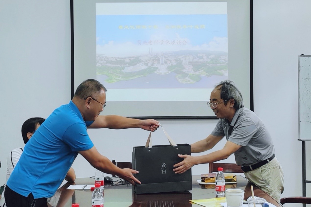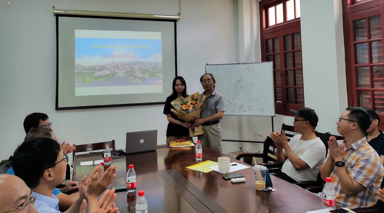 仪式上,系主任曹剑波介绍了贺威老师的工作经历和主要学术成果,他对贺威老师在厦大31年的教学生涯予以肯定,并表达了对贺威老师未来荣休生活的祝福。他谈到,贺威老师在工作上面顾大局、识大体,立足本职,爱岗敬业,扎实工作,任劳任怨,勤勤恳恳,与系里各位老师的关系都非常融洽,希望贺老师能够健康长寿。