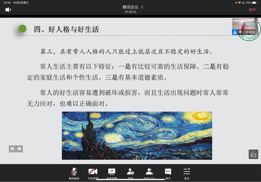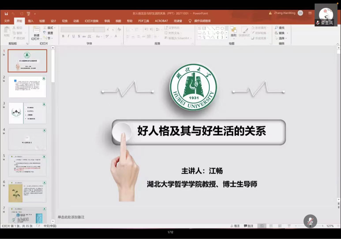 2021年10月6日14:30—16:30,南强哲学论坛第238期学术讲座于腾讯会议线上举行。本次讲座题为《好人格及其与好生活的关系》,由湖北大学哲学学院教授、湖北大学高等人文研究院名誉院长江畅教授担任主讲,由厦门大学哲学系张会永教授担任主持,哲学系各专业师生及校内外听众共二百余人参与本次讲座。