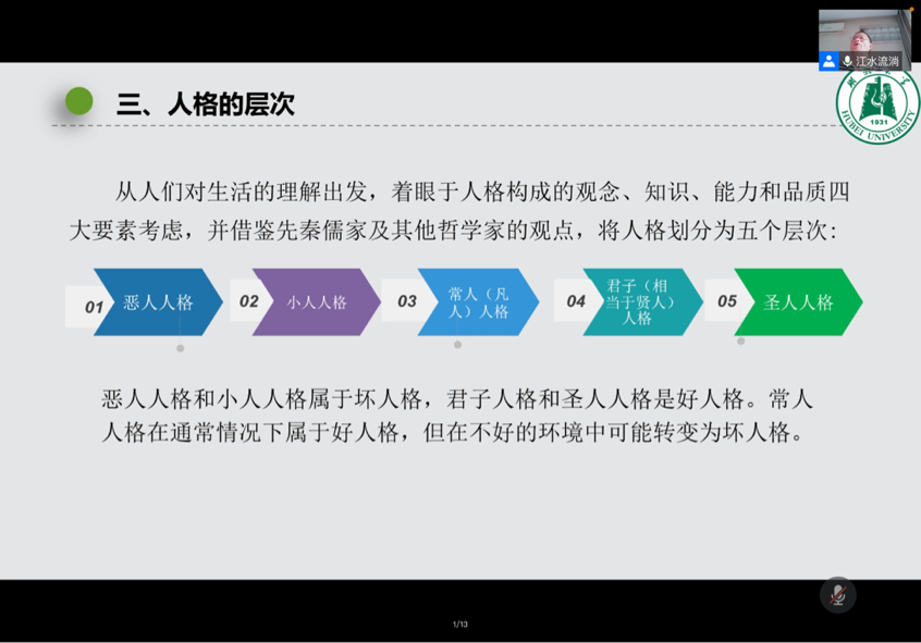 随后,江教授将人格自低至高依次划分为恶人人格、小人人格、常人人格、君子人格、圣人人格五个层次。恶人人格和小人人格形成于对人性的不充分开发,二者都在观念体系、道德品质和性格情感等方面存在着或多或少的问题,因而都是坏的人格;作为大多数人拥有的人格,常人人格形成于开发较为充分的人性,它是最低层次的好人格,但也容易在不好的环境中滑向坏人格;君子人格和圣人人格在观念、知识、能力和德性等各方面均达到了比较完善的程度,使人在充分满足自身生存需要并实现人格健全的前提下,还在不断追求自我实现。人格完善与人性境界一致,所谓的“人生境界”就是五种不同的人格层次现实化的结果。