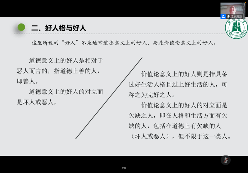 最后,江教授就好人格与生活的关系作出了一番总结,认为好人格就是能让人真正过上好生活的人格——如果不考虑外在条件,好人格是与好生活成正比的,更好的人格会使人过上更好的生活。因此,任何想要过上好生活的人都要塑造好的人格。