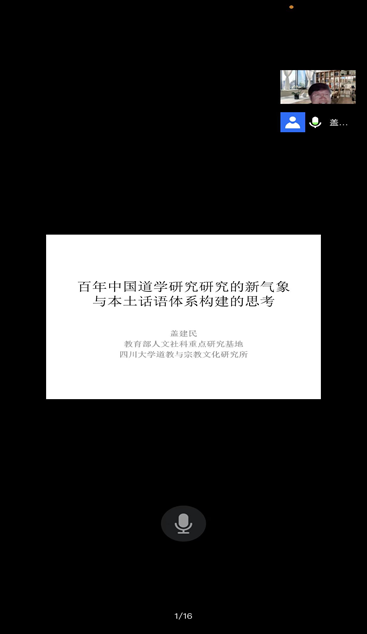 讲座中,盖教授首先梳理总结了百年中国道学研究学术历程,介绍了从20世纪初到1949年是道教学研究的第一阶段,1950年至1966年是第二阶段,内地道教学研究真正开展起来的是1977年至今,此为第三阶段。进而,盖教授引申出“中国学派”话语体系建构问题。“道学”三大体系建构:学科体系、学术体系、话语体系。他指出,道学学科体系是基础,有形而上与形而下之分,道学学术体系是支撑,是历史沉淀的产物,道学话语体系是核心,是学术传播的主导,也是建构道学评价指标与评价体系的关键与核心。