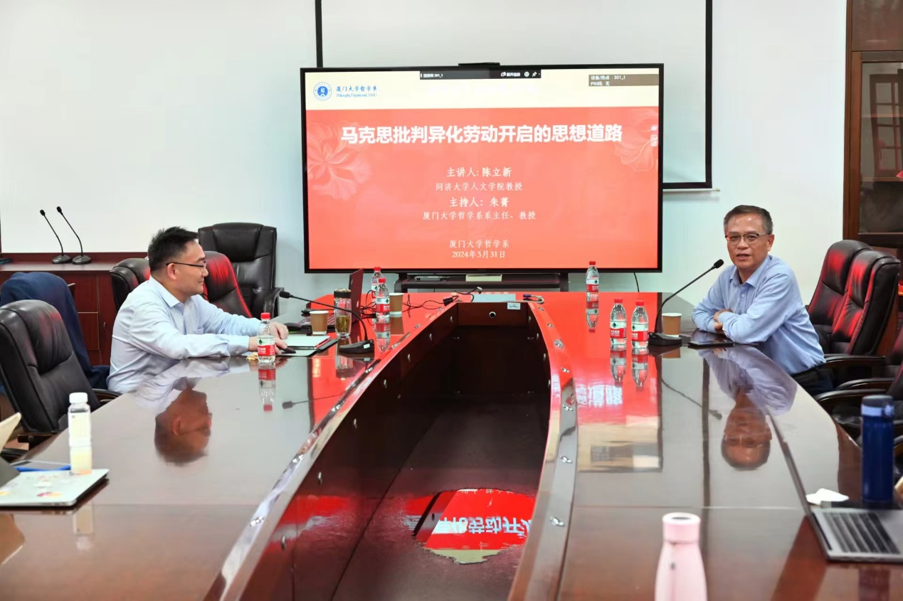 2024年3月31日上午,厦门大学南强哲学论坛第377期在南光一320会议室举行。同济大学人文学院教授陈立新进行了题为《马克思批判异化劳动开启的思想道路》的讲座。本次讲座由哲学系系主任朱菁教授主持。