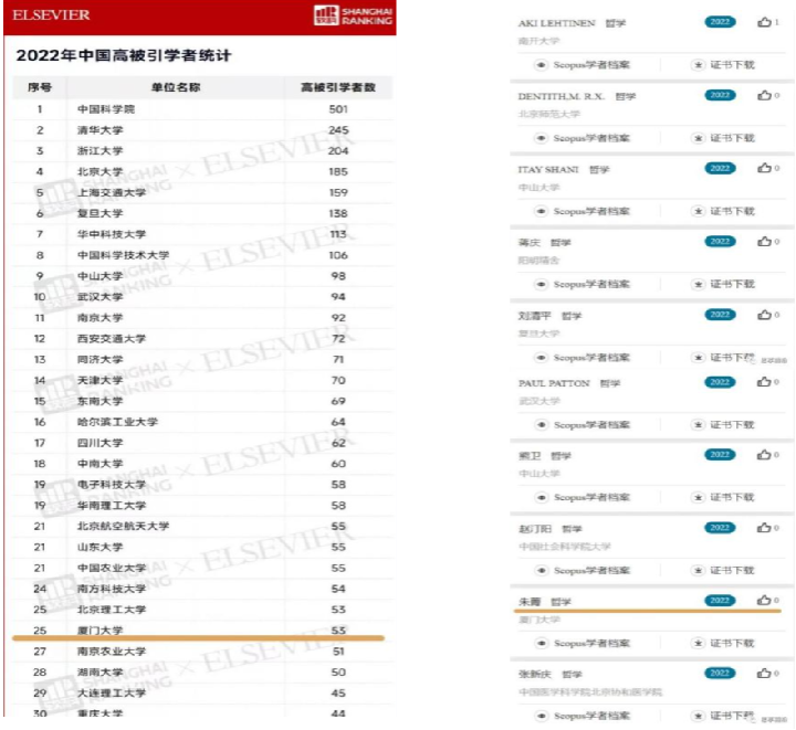 3月28日,全球性信息分析公司爱思唯尔(Elsevier)正式发布了2022“中国高被引学者”榜单。厦门大学共有53名学者入选,排名全国高校第25名。