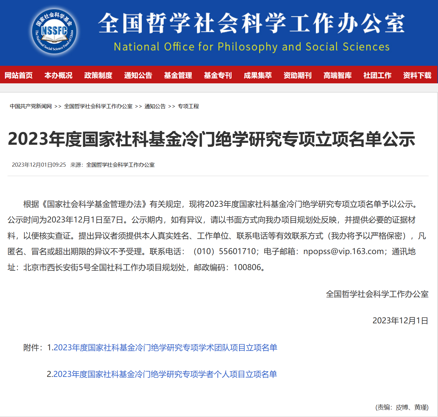 12月1日,全国哲学社会科学工作办公室发布《2023年度国家社科基金冷门绝学研究专项立项名单公示》。厦门大学共有3个项目获批立项,其中国家社科基金冷门绝学研究专项学术团队立项共2项,学者个人项目立项共1项。哲学系陈玲老师学术团队获2023年度国家社科基金冷门绝学研究专项立项: