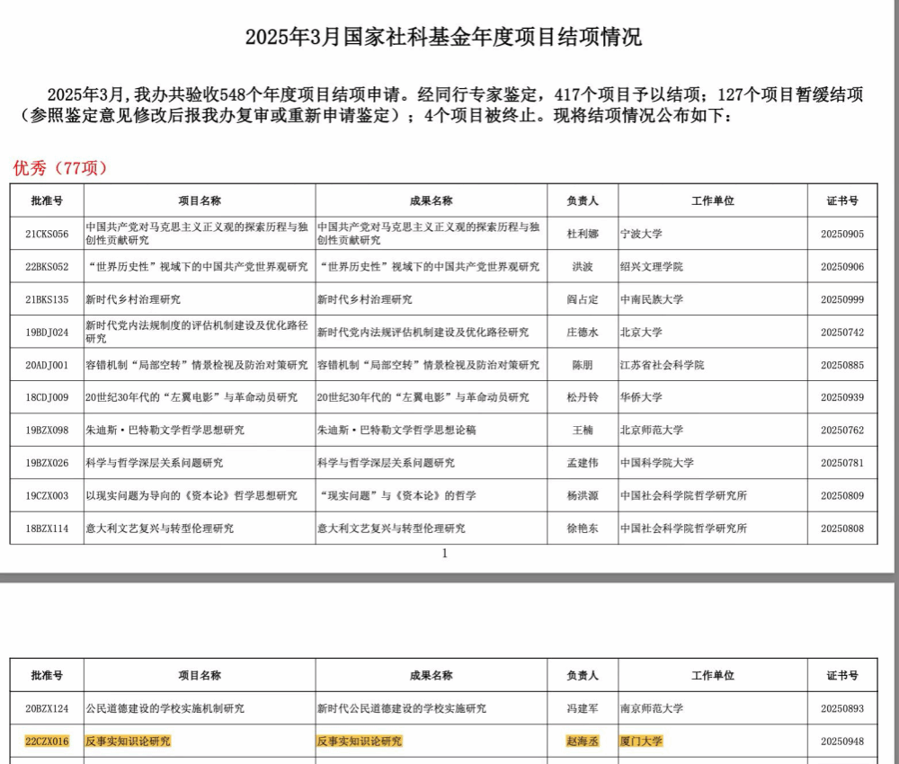 2025年4月2日全国哲学社会科学工作办公室网站公布了2025年3月国家社科基金年度项目结项情况。厦门大学哲学系赵海丞副教授主持的《反事实知识论研究》(22CZX016)课题荣获“优秀”等级结项。