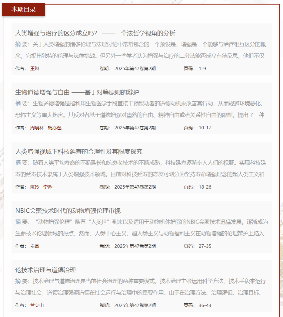 《自然辩证法通讯》2025年第47卷第2期刊登我系陈玲教授的文章——《人类增强视域下科技延寿的合理性及其限度探究》。