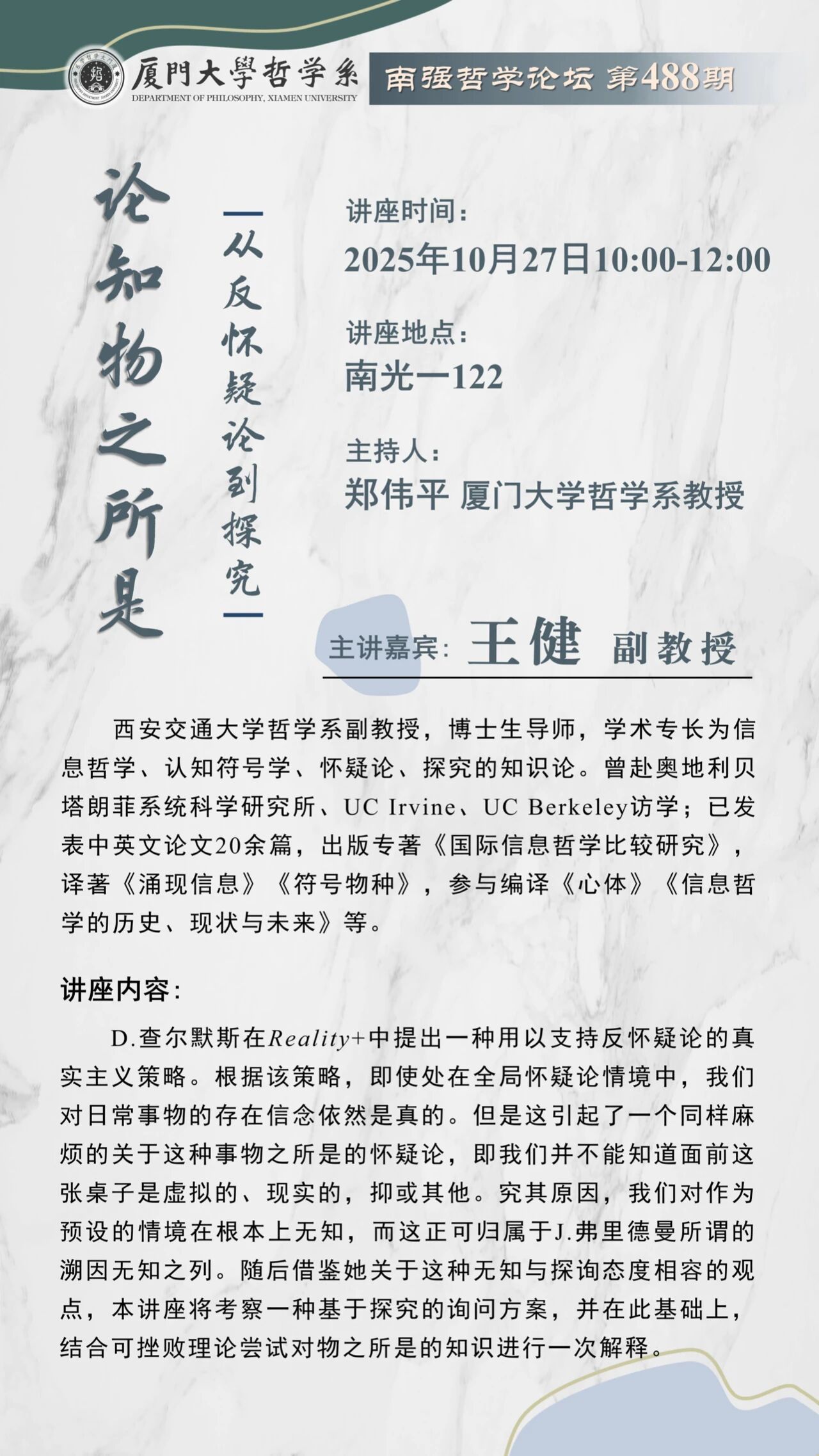 王健,西安交通大学哲学系副教授,博士生导师,学术专长为信息哲学、认知符号学、怀疑论、探究的知识论。曾赴奥地利贝塔朗菲系统科学研究所、UC Irvine、UC Berkeley访学;已发表中英文论文20余篇,出版专著《国际信息哲学比较研究》,译著《涌现信息》《符号物种》,参与编译《心体》《信息哲学的历史、现状与未来》等。