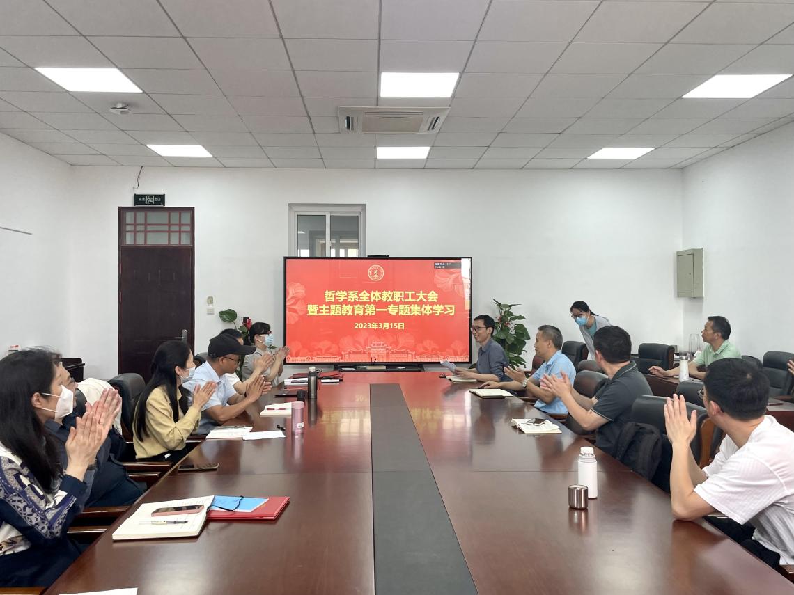 首先,杨松传达了学习贯彻习近平新时代中国特色社会主义思想主题教育有关精神,强调全体教职工要深刻理解主题教育的重大意义,自觉加强党的创新理论武装,推动党建与事业发展深度融合,推动哲学系办学内涵式发展。接着,全体教职工以习近平总书记在学习贯彻习近平新时代中国特色社会主义思想主题教育工作会议上的重要讲话为内容进行集体学习。