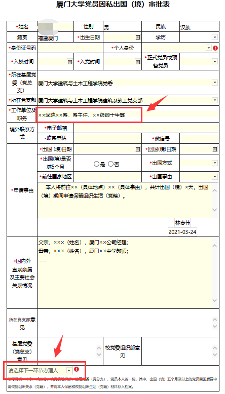 1.选择进入“党员因私出国(境)申请”程序,填写《厦门大学党员因私出国(境)审批表》。其中,标“*”项目为必填项,部分项目已加载填写范本,如“工作单位及职务”,可以直接编辑修改成正确的信息。