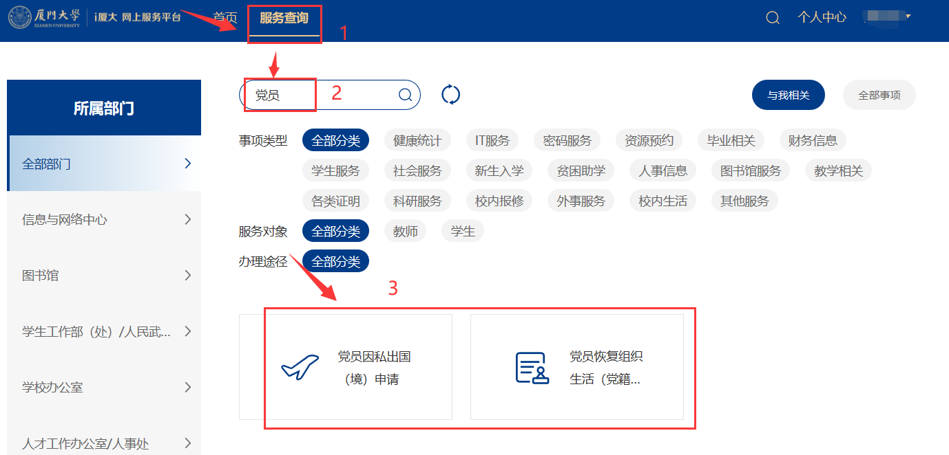 校内党员一般在“厦门大学信息门户”网站上申请保留和恢复组织生活(党籍),具体操作步骤如下: