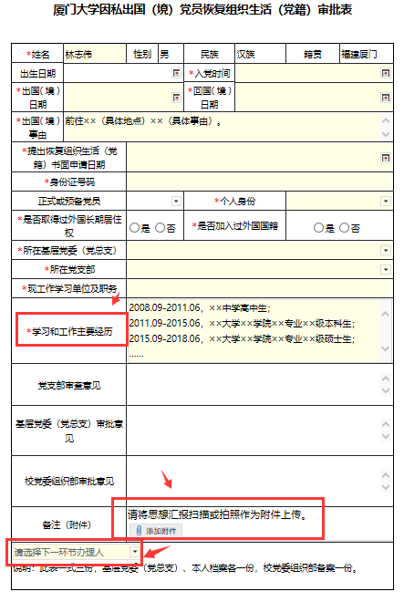1.选择进入“党员恢复组织生活(党籍)申请”程序,填写《厦门大学因私出国(境)党员恢复组织生活(党籍)审批表》。其中,标“*”项目为必填项,部分项目已加载填写范本,如“学习工作主要经历”,可以直接编辑修改成正确的信息。