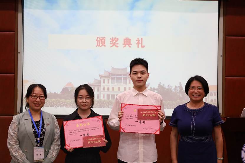校党委党的建设工作办公室主任、组织部副部长、教师工作部副部长廖志丹副教授、校党委党校副校长何丽新教授为获得一等奖的选手颁发奖金和荣誉证书