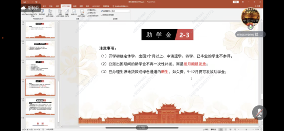 接下来,历史与文化遗产学院团委书记王旖旎老师介绍了厦门大学研究生奖助学金政策。厦门大学奖助学金评选体系完善、种类丰富,为同学们的科研学习生活提供着坚实的基本保障和丰富和激励机制。王旖旎老师鼓励同学们努力深耕,全面发展,积极评选。