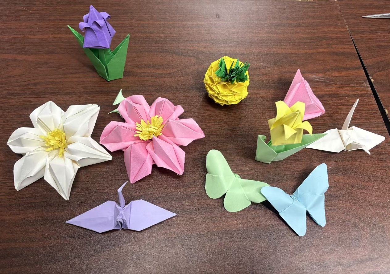 下午主讲的课程题目是《中国传统技艺——折纸》,主讲人将千纸鹤女孩的感人故事娓娓道来,引出了今天手工活动的主题——折纸。志愿者将视频演示和线下示范相结合,带领小朋友们学会了千纸鹤、蝴蝶、郁金香的折法,在志愿者的耐心指导下,小朋友们为四四方方的彩纸赋予了独特的灵感和意蕴,教室的木桌板飞出千纸鹤、蝴蝶,长出郁金香、栀子花,普普通通的教室也仿佛被小朋友们的奇思妙想点亮。在欢乐的氛围中,课程走向了尾声。