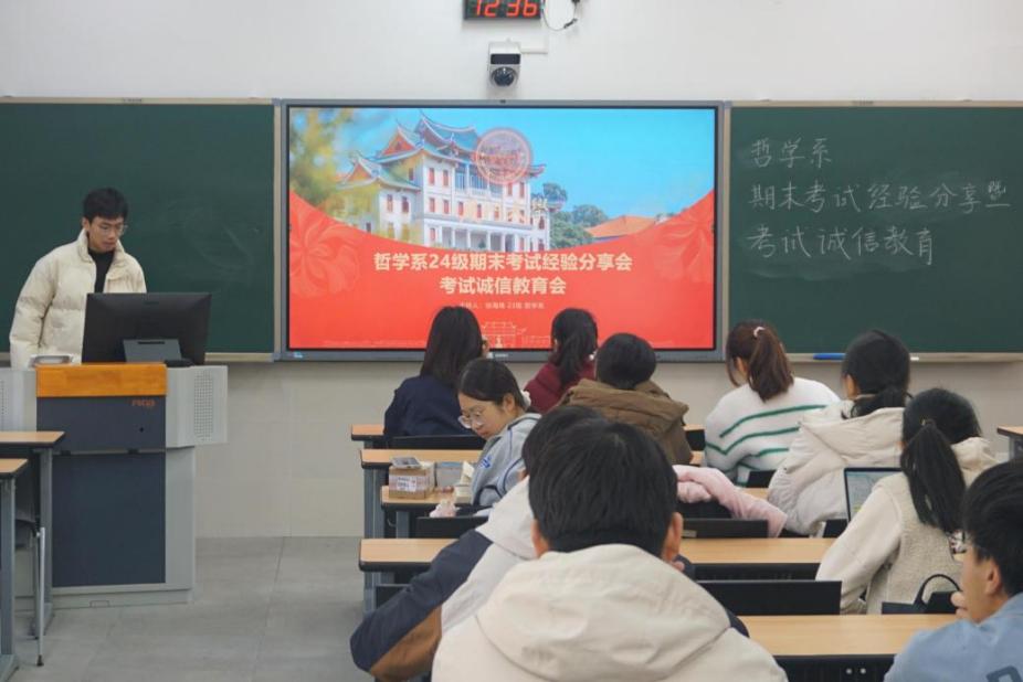 12月20日下午,哲学系2024级本科生期末考试复习经验分享与考试诚信教育主题班会于庄汉水楼102顺利举行。本次大会由哲学系学术部部长徐海烽主持,2024级哲学系全体本科生参与了本次会议。