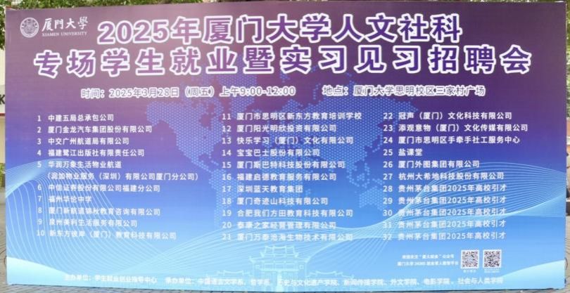 为促进我校2025届毕业生高质量充分就业,助力学生拓展就业渠道、提升职业竞争力,为广大学子创造更多就业与实习机会,3月28日上午,厦门大学人文社科专场学生就业暨实习见习招聘会于思明校区三家村广场顺利举办。