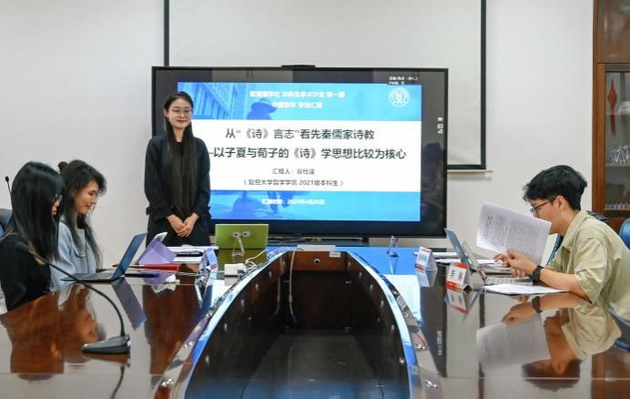 在第一期沙龙中,复旦大学哲学学院2021级本科生翁仕逵率先开讲。她以《从“〈诗〉言志”看先秦儒家诗教思想——子夏与荀子〈诗〉学思想的比较研究》为题,深入剖析孔门后学对《诗》教传统的不同诠释路径。在交流中,翁同学指出,子夏以“礼后乎仁”为核心,通过《论语》中“绘事后素”的经典对话,揭示诗教的本质在于回归内心的道德自觉,强调“克己复礼”作为君子成德的内在根基;而荀子则以“圣人之志”为切入点,通过《荀子》中83处引《诗》文本,展现其“隆礼杀《诗》”的外王取向,主张通过礼义法度将诗教外化为社会治理的规范体系。二者对“《诗》言志”的不同诠释,本质上折射出先秦儒家重建礼乐秩序的两种路径——子夏重“心”的内在涵养,荀子重“礼”的外在建构,为“经典的儒家化”研究提供了新的思想史视角。