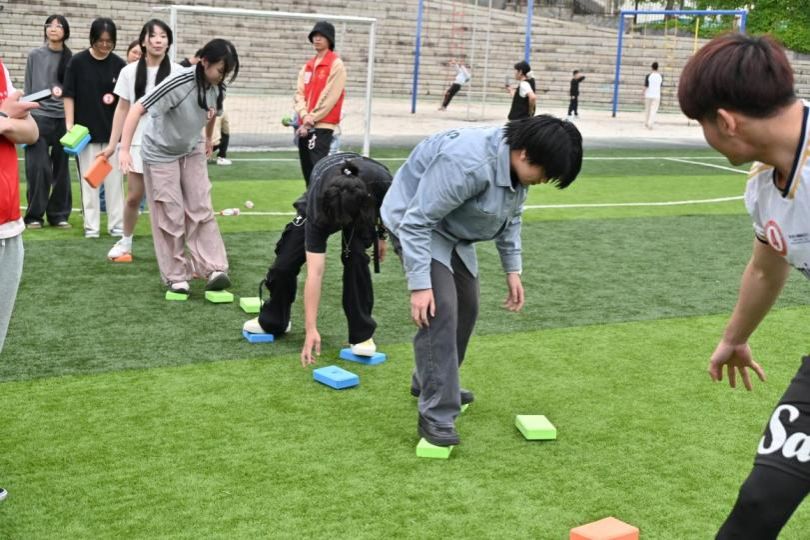 在“摸石过河”接力赛中,选手们需要踩着“石头”(泡沫板)一步步前进, 既要保持平衡,又要追求速度。他们小心翼翼,步步为营,这场比赛充分考验了选手们的平衡能力。
