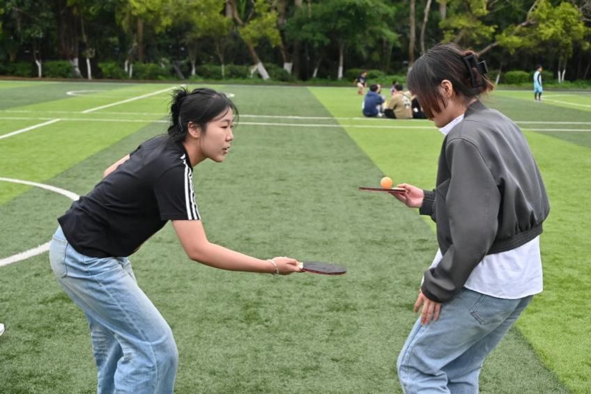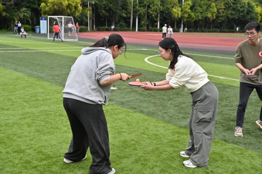 最后一个项目是托球跑接力赛,选手们手持球拍,托着小球稳步前行,既要保持球拍的平衡,又要追求奔跑的速度,锻炼了同学们的稳中求胜的本领。