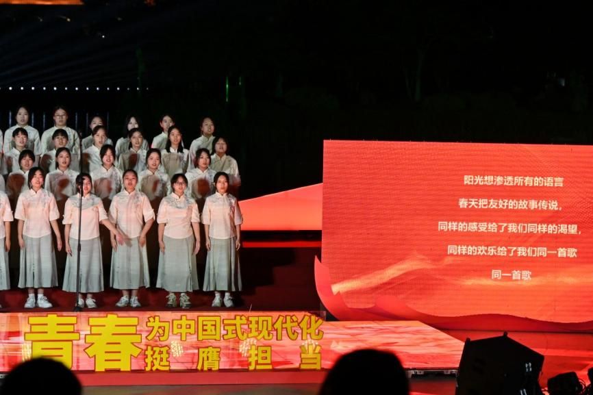 当舞台灯光渐次亮起,哲学系学子们身着中式衬衫与素色长裙长裤款步登场。"鲜花曾告诉我你怎样走过……"清越的引子如晨露滴落湖面,主歌部分女生声部如丝绸般流淌,男生声部以浑厚和声为基底,副歌时全体成员以教科书级的声部衔接将情绪推向高潮。节奏起落间,大家的眼睛闪烁着光芒,歌声在湖面荡起层层涟漪,连夜风都放轻了脚步。