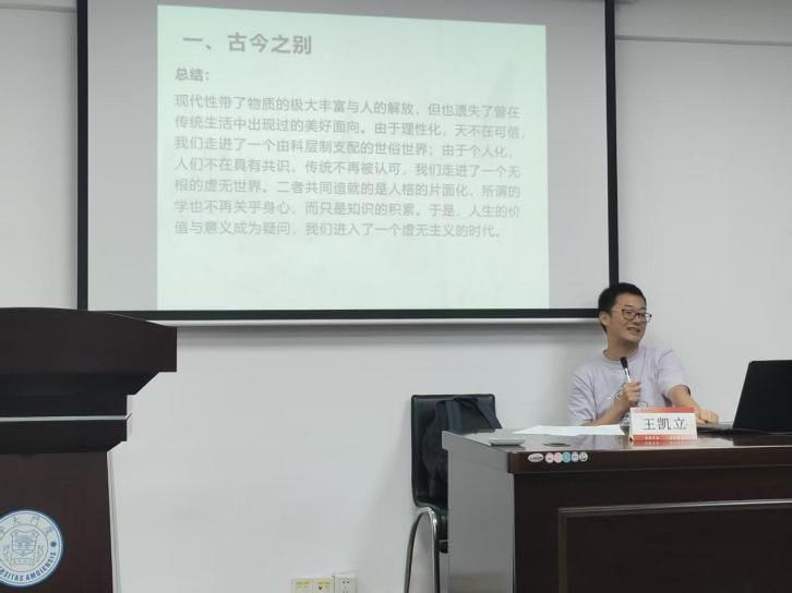 在剖析“古今之别”时,王老师对比了古代“大学”与当代教育的差异,从“天的隐退”“身心之学转变为知识之学”“传统的疏离”三个维度解析“大学”概念。接着,王老师通过援引韦伯“理性化”理论,分析自然科学方法、官僚制“非人性化”等现象对教育价值维度的削弱,并结合个人权利高涨、道德共识缺失等现状,揭示现代社会面临的精神困境。王老师的深刻分析引发了学员们对学习本质、人生价值的深入思考。