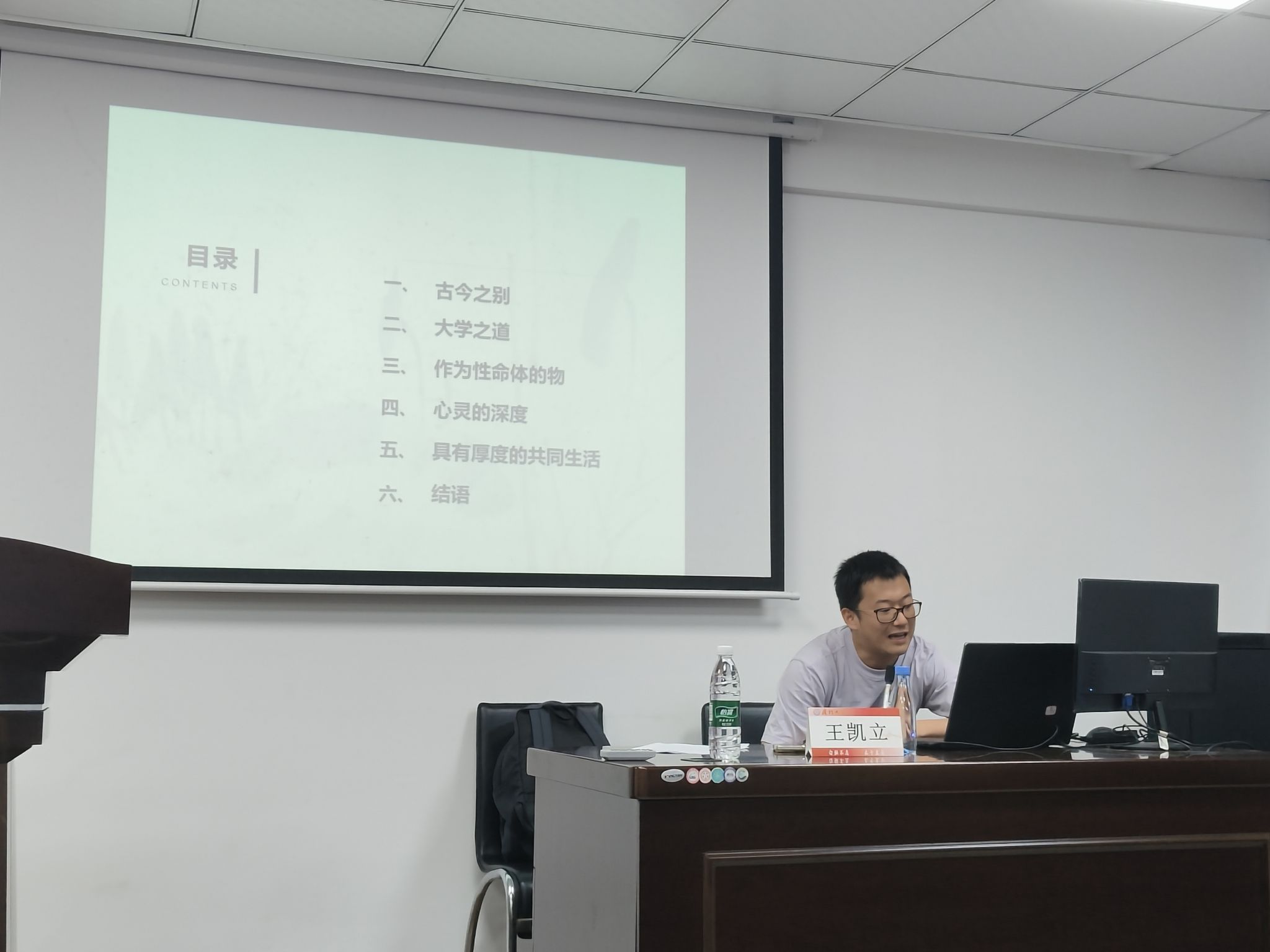5月23日晚,厦门大学哲学系“马克思主义与中华优秀传统文化研修班”在联兴楼102开展了第四次授课,本次授课也同时为“红心向党”成长营学生入党积极分子2025年第六次集中培训,哲学系助理教授王凯立老师为同学们带来了“《大学》与现代生活”的主题报告。系团委书记蔡振磊老师、辅导员林晋扬老师出席了本次授课。