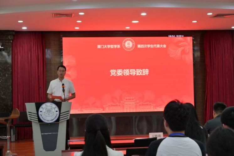 厦门大学哲学系第四次学生代表大会在庄严的国歌声中正式拉开序幕。哲学系党委副书记王晓萌老师致开幕辞。他首先对大会的召开表示热烈祝贺并代表系党委向哲学系第三届学生会的认真工作表示真挚感谢,并对新一届学生会提出了三点期望:一是锚定思想引领核心,筑牢理想信念根基,践行习近平总书记关于青年工作的重要思想,将广大哲学系学子凝聚在党的周围;二是坚守服务初心,做同学成长的“暖心人”,打造同学们“想得起、找得到、靠得住”得温暖家园;三是坚持在学习中提升,在实践中成长,不断提升自身综合素质,实现全面发展,成为新时代的复合型人才。最后,王老师号召全体学生会成员团结和带领全系同学继承和发扬哲学系百年办学优良传统,勇担使命,锐意进取,奋力谱写哲学系“双一流”建设新篇章。