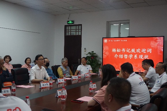 首先,哲学系党委书记杨松教授发表了热情洋溢的欢迎词,并向在场的校友们详细介绍了哲学系的现状,包括强基计划、学科亮点、近年获奖等情况,并阐述了对于哲学系未来的积极展望。